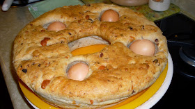 Disporre la farina a fontana,mettervi il lievito,il pepe,il sale e la sugna.Cominciare ad impastare con l'acqua tiepida,far assorbire tutta la sugna,in modo che l'impasto diventi vellutato e che non si attacchi sul piano di lavoro.A questo punto aggiungere tutti i salumi e formaggi misti tagliati a pezzettini.Lavorare tutto costantemente,dare la forma di un tarallo e disporlo in una teglia unta di sugna.Inserire sull'impasto le uova sode ,e far crescere due ore.Cuocere in forno a 18o° per circa un'ora.