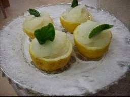 Versare il composto nella gelatiera,e mantecare fino ad ottenere il sorbetto.Nel frattempo svuotare le scorze dei limoni,quando il sorbetto è pronto,riempire le coppette,completare con foglioline di limoni messe a gelare nel freezer.