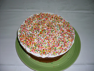 Cuocere per 45 minuti a 170°,quando è freddo,coprire con una glassa di acqua e zucchero.Coprire con confettini colorati.