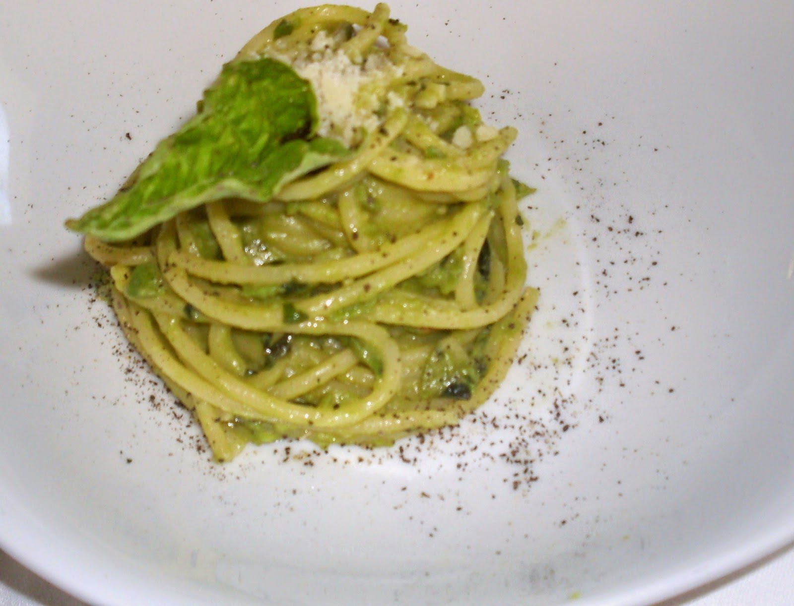 Mettere i piselli in una casseruola,copriteli con acqua ,salate,portate ad ebollizione,fate cuocere per 6o7 minuti,finche non risulteranno teneri.Sbucciare l'aglio ,schiacciatelo,mondate il basilico,tritate insieme nel frullatore con i piselli,i gherigli di noce.Unite i grana grattugiato,versate a filo 2 cucchiai di olio,salatelo.Il composto deve risultare liscio e omogeneo.In una pentola,portate ad ebolizzione abbondante acqua salata,versatevi la pasta e portatela a cottura,scolatela,conservate mezzo bicchiere di acqua.Unite il pesto all'acqua di cottura,mescolate,condite gli spaghetti,distribuite nei piatti,cospargere di grana,guarnire con foglie di basilico intere.Spruzzare con pepe nero.