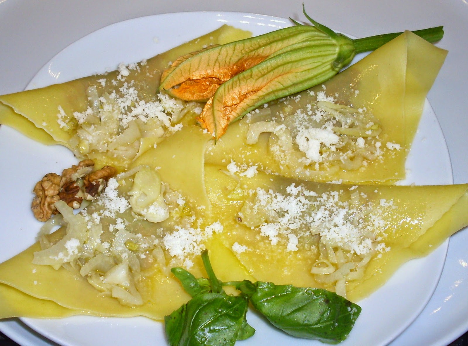 Far bollire l'acqua per la pasta,appena bolle,calare le sfoglie,far cuocere per alcuni minuti,scolare e fare raffreddare.Tagliare la pasta in 8 quadrati,mettere al centro il ripieno distribuendolo per tutte le sfoglie,piegare a fazzoletto.