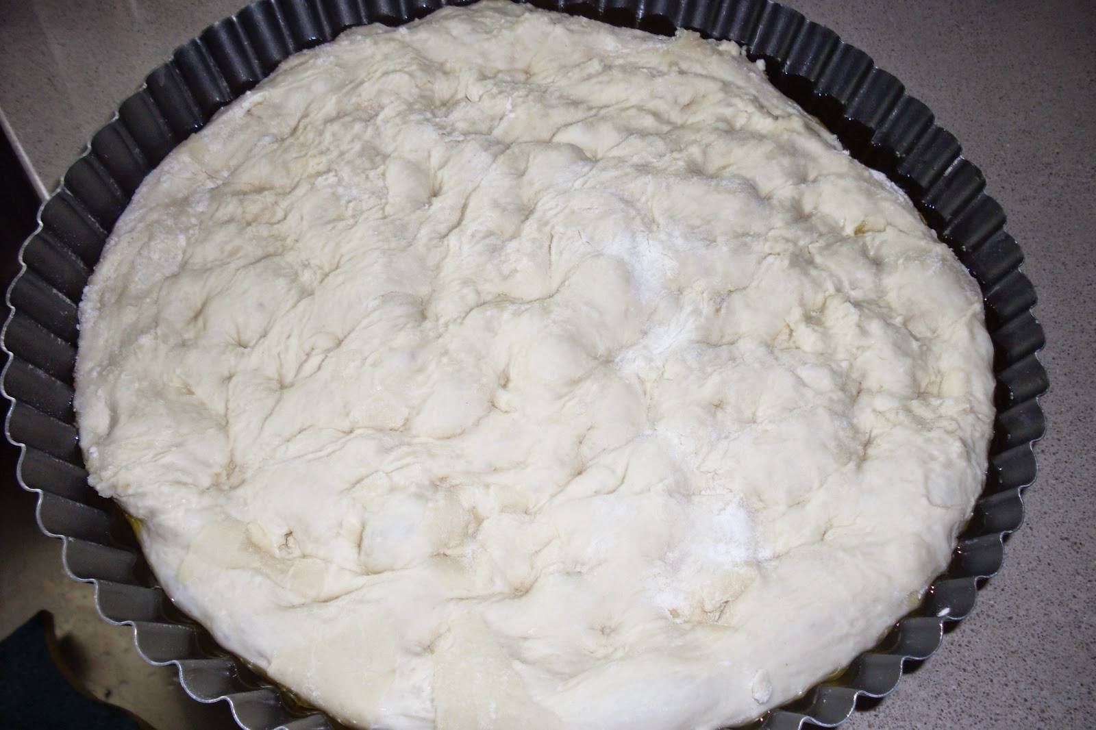 A questo punto,riprendere l'impasto,stenderlo su carta da forno oleata pizzicandolo all'interno ,aggiungere dell'olio,bagnare con acqua,far riposare per 10 minuti.