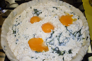 Foderate uno stampo con la prima sfoglia tirata sottile ed unta con un pennello,sovrapponete la seconda ,riempite con il composto di bietole e ricotta,fate degli incavi dove metterete le uova coperte di un pizzico di sale,un po' di pepe,un cucchiaio di parmigiano grattugiato.Ricoprite con la terza e quarta sfoglia sempre tirate sottili e oleate,chiudete bene i bordi.A questo punto se avete una cannuccia,fate un forellino in un punto della torta ,soffiare finche' non si gonfia.Cuocere per 45 minuti a 180° forno ventilato.