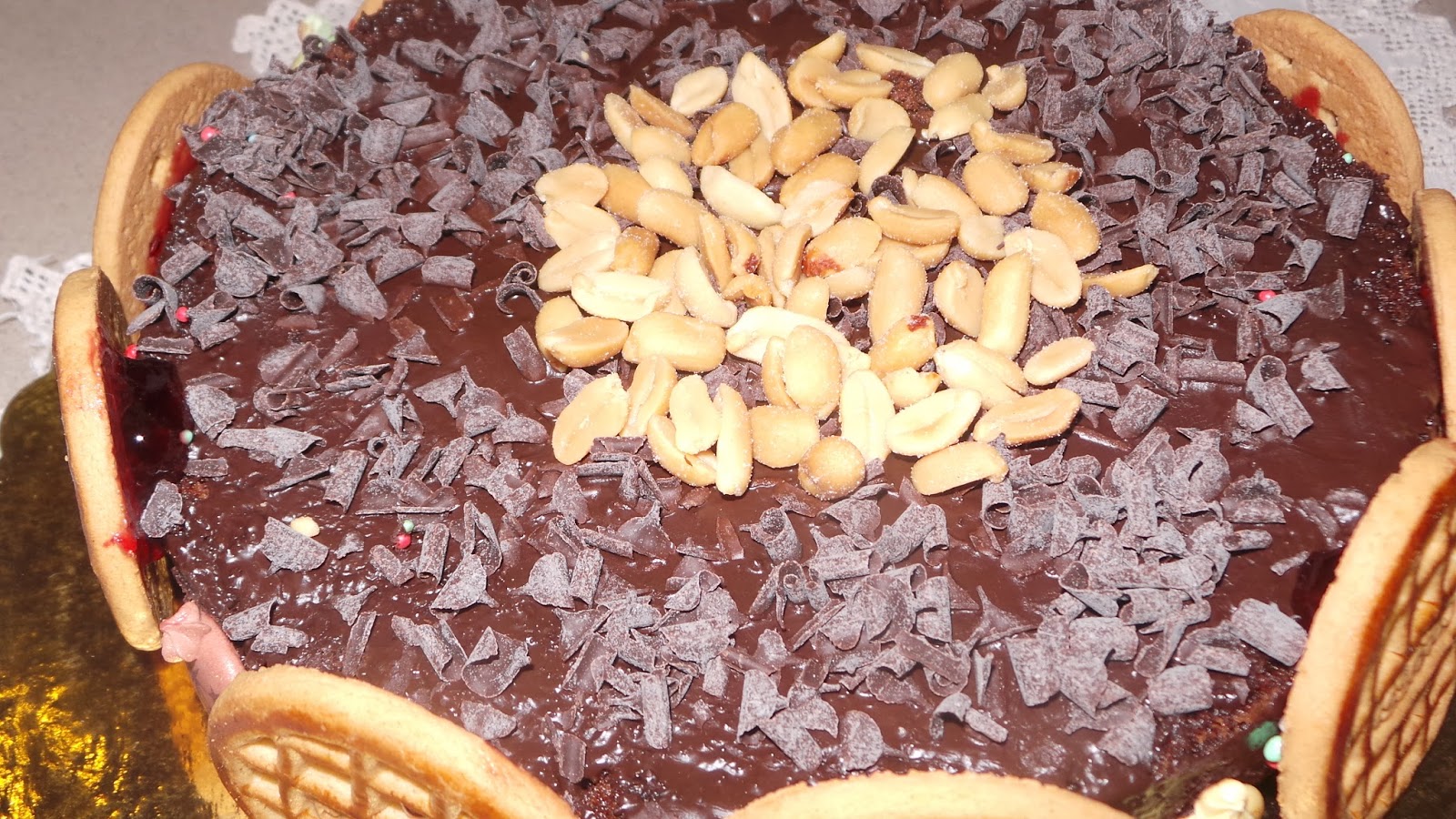 Tagliare la torta in due parti,sulla prima parte spalmare una parte della ganache,coprire con il pezzo superiore,rivestire la torta con la crema rimasta.Guarnire prima con i riccioli di cioccolato,mettere al centro le noccioline tostate e tritate(a piacere),incollare i biscotti intorno tutta la torta con marmellata a piacere.