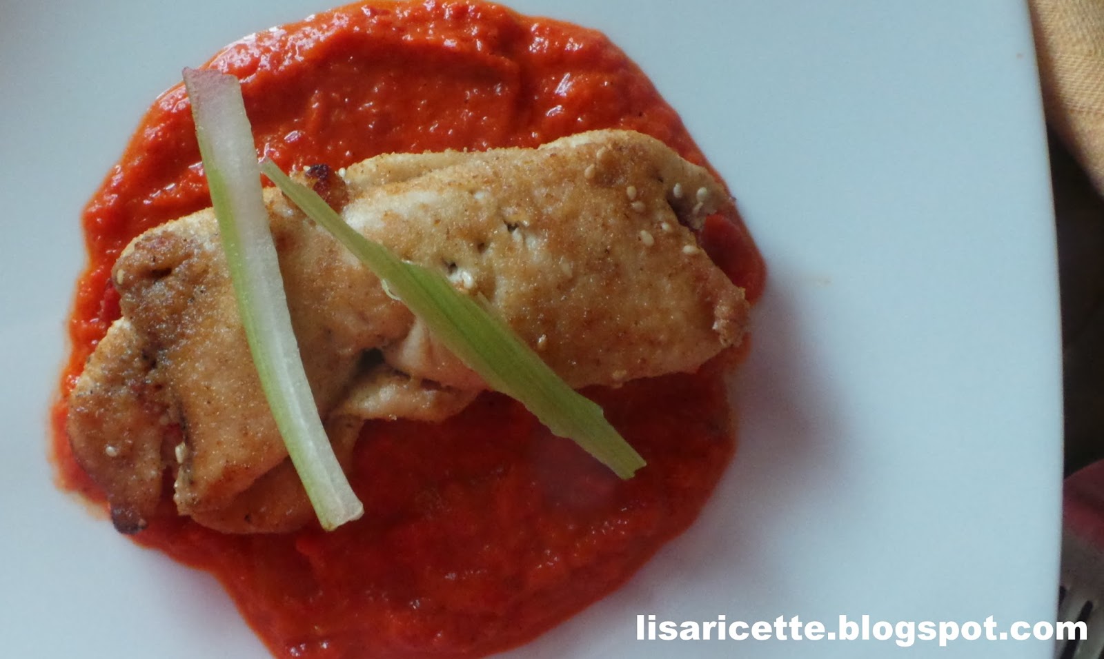 Intanto arrostite il peperone rosso sulla griglia,fatelo raffreddare ed eliminate la pelle.Mettetelo nel frullatore con i pomodori,il peperoncino,il sale e frullate per qualche secondo.Quando i petti di pollo saranno cotti,scaldate la salsa. Versatene un po' nei piatti da portata caldi,adagiate i petti di pollo al centro.Guarniteli con striscioline di sedano e rami di dragoncello fresco.