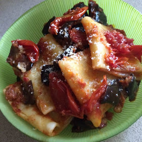 Paccheri con pomodorini confit,melanzane,pecorino nero .