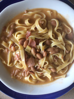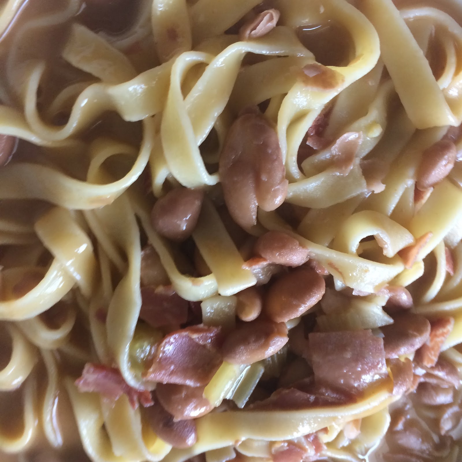 La sera prima ,mettere a bagno i fagioli in acqua tiepida,al mattino cuoceteli per circa un'ora ,quando sono cotti,aggiungete l'olio,il sale,un gambo di sedano,e continuate a cuocere,unite l'aglio ,,,.Tagliate il prosciutto a pezzi grossi separandolo dalla cotica che batterete su un tagliere di legno con un coltello abbastanza grosso.Lardellate la cotica piu' volte (il grasso deve fuoriuscire staccandosi quasi dalla cotica).Procedete nello stesso modo con la carne del prosciutto.Lessate le fettuccine al dente e a cottura avvenuta,aggiungetele ai fagioli con la cotica ,possibilmente in una pentola di alluminio o di rame,saltate tutto piu' volte,unite un filo di olio ancora ed il peperoncino in polvere o a pezzetti.